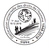 Fondée en 1945 sur les décombres de la Seconde Guerre mondiale, l'ONU aspire à libérer le monde de la peur et de la barbarie en remplaçant le régime du droit du plus fort par celui de la force du droit. Pour ce faire, les Nations Unies décident de rédiger un texte de référence qui formera « l'idéal commun à atteindre par tous les peuples et toutes les nations ». Un comité de rédaction est formé, sous la présidence d'Eleanor Roosevelt, composé de 18 membres dont le Français René Cassin, juriste et résistant, ancien délégué français à la SDN et futur prix Nobel de la paix. Le 10 décembre 1948, les 30 articles de la Déclaration universelle des droits de l'homme sont présentés à Paris, au palais de Chaillot. En précisant que « les hommes naissent libres et égaux en dignité et en droits », l'article 1er s'inspire directement de son illustre devancière, la Déclaration des droits de l'homme et du citoyen de 1789. Lui succèdent le droit à la liberté, l'interdiction de l'esclavage, de la torture, de l'arrestation arbitraire, la liberté de pensée, de culte, de circulation, le droit au travail, à l'éducation, etc. Mais la force de ces principes est limitée : bien que présentée comme le fondement de l'oeuvre législative de l'ONU, cette déclaration demeure symbolique car elle n'a pas de valeur juridique. Inspirant ensuite une Déclaration des droits de l'enfant (1959) et un Pacte international relatif aux droits économiques et sociaux, civils et politiques (1966), aux dispositions théoriquement contraignantes pour les pays signataires, la Déclaration universelle des droits de l'homme demeure un phare, une référence, la promesse d'un monde plus juste. © La Poste – Jean-Yves Le Naour
