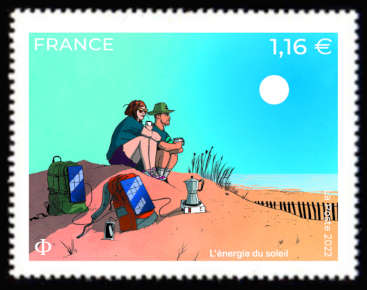 L’Homme est donc confronté à une injonction contradictoire : d’un côté à une exigence de besoins énergétiques de plus en plus élevée de l’autre, une consommation excessive d’énergie qui conduit à un dérèglement climatique responsable de dommages irréversibles sur notre environnement au point que la survie même de l’Humanité s’en trouve questionnée. Face à ce constat inquiétant, des solutions existent pourtant. La première d’entre elles relève du bon sens : c’est la sobriété énergétique. Nos modes de consommation doivent évoluer pour devenir plus raisonnables et raisonnés : isolation des bâtiments, frugalité dans nos consommations quotidiennes, priorisation de l’usage sur la propriété , pondération dans nos usages du numérique…. Un autre levier majeur est illustré par ces quatre timbres : l’énergie de l’eau, du vent, du soleil et de la matière vivante. Les énergies renouvelables comme alternatives, offertes gracieusement par la Nature, sont inépuisables et leur usage ne génère pas d’émission de CO2.